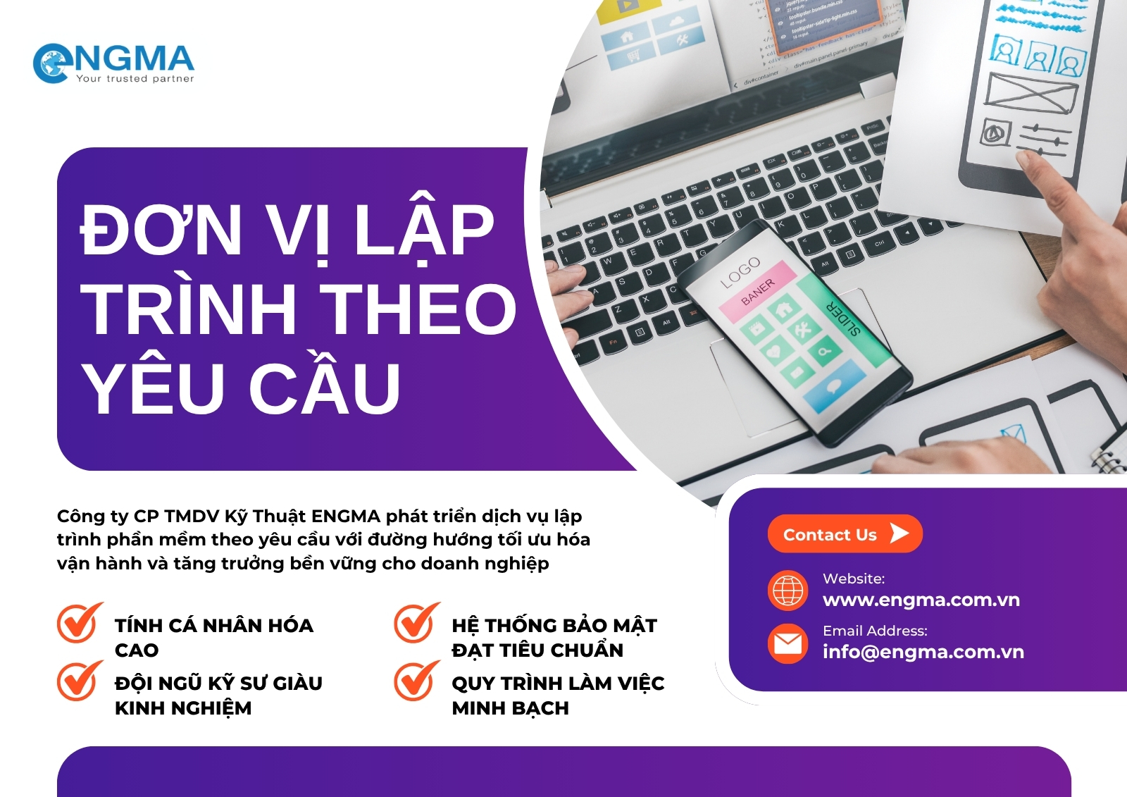With many years of experience in the technology industry, ENGMA Technical Trading and Service Joint Stock Company develops software programming services on demand with the direction of optimizing operations and sustainable growth for businesses. ENGMA becomes The software development company is chosen by many partners thanks to its ability to provide comprehensive solutions from management systems, mobile applications to specialized business software.